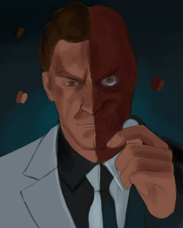 Di sinilah kita menangani pekerjaan line. Kami akan menangani langkah ini dalam dua lapisan, Lapisan pertama akan menjadi pekerjaan awal, di mana kita fokus pada tampilan dasar gambar dan fokus pada bentuk utama, gerakan, dan bentuk karakter. Lapisan kedua, yang kita akan nama 'sketsa', akan di mana kita mengambil waktu kita dan pergi ke pekerjaan baris kami ada untuk memastikan penampilan bersih.Menggunakan sikat keras bermata dengan opacity cukup rendah, aku cepat-cepat sketsa karakter, sambil melihat berbagai foto yang berbeda untuk referensi. Dalam hal ini, saya punya saudara saya berpose untuk berpose umum dan pencahayaan (aku ingin cahaya datang dari bawah untuk memberikan gambar penampilan dinamis). Saya juga melihat beberapa referensi dari film 'The Dark Knight', karena saya ingin meniru terbakar / terluka sisi wajahnya. Ini penting untuk menghabiskan cukup banyak waktu pada pekerjaan line, karena hal ini akan membuat proses pengecatan yang lebih mudah.